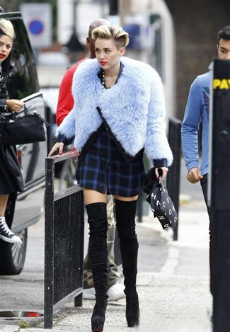 麦莉披华丽皮草现身摄影棚外,一双Christian Louboutin过膝长靴尤其惹眼。