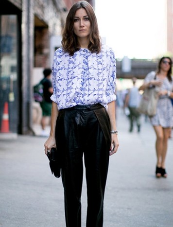 蓝白镜像印花衬衫清新雅致,将衬衫扎进宽松皮裤,营造一份随性休闲感。搭配一双及踝细高跟和和黑色手拿包,散发着更多女人韵味。